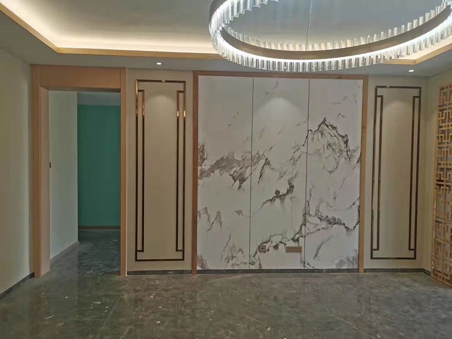 電視背景與沙發(fā)背景局部的木元素和黃銅浮雕構(gòu)件,使整體空間感覺更加豐富,大而不空、厚而不重,有格調(diào)又不顯壓抑。